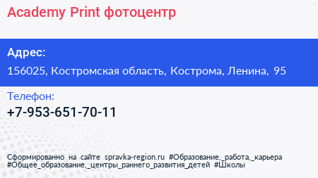 Academy Print, фотоцентр по адресу 156025, Костромская область, Кострома, Ленина, 95 в дальнейшем Организация, размещена в следующих категориях: