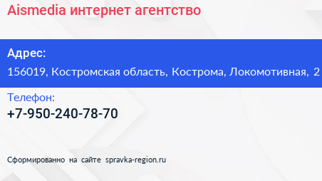 Aismedia, интернет-агентство по адресу 156019, Костромская область, Кострома, Локомотивная, 2 в дальнейшем Организация, размещена в следующих категориях: