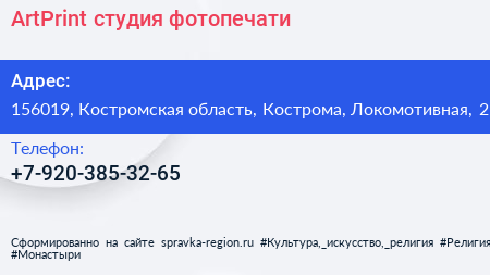 ArtPrint, студия фотопечати по адресу 156019, Костромская область, Кострома, Локомотивная, 2 в дальнейшем Организация, размещена в следующих категориях: