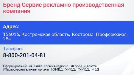 Бренд Сервис, рекламно-производственная компания по адресу 156016, Костромская область, Кострома, Профсоюзная, 28а в дальнейшем Организация, размещена в следующих категориях: