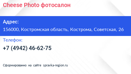 Cheese Photo, фотосалон по адресу 156000, Костромская область, Кострома, Советская, 26 в дальнейшем Организация, размещена в следующих категориях: