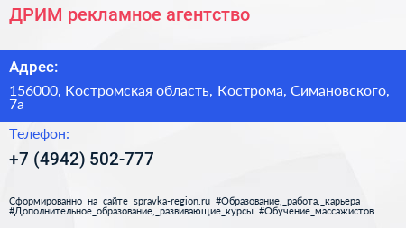 ДРИМ, рекламное агентство по адресу 156000, Костромская область, Кострома, Симановского, 7а в дальнейшем Организация, размещена в следующих категориях: