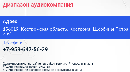 Диапазон, аудиокомпания по адресу 156019, Костромская область, Кострома, Щербины Петра, 7 к1 в дальнейшем Организация, размещена в следующих категориях:
