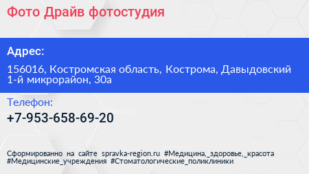 Фото-Драйв, фотостудия по адресу 156016, Костромская область, Кострома, Давыдовский 1-й микрорайон, 30а в дальнейшем Организация, размещена в следующих категориях: