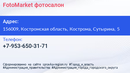 FotoMarket, фотосалон по адресу 156009, Костромская область, Кострома, Сутырина, 5 в дальнейшем Организация, размещена в следующих категориях: