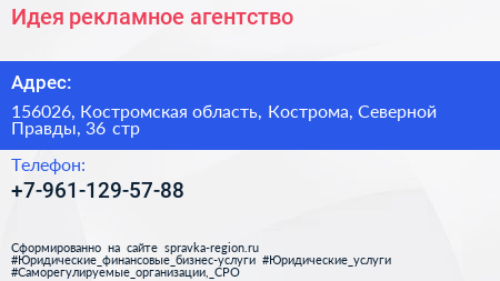 Идея, рекламное агентство по адресу 156026, Костромская область, Кострома, Северной Правды, 36 стр в дальнейшем Организация, размещена в следующих категориях: