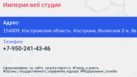 Империя, веб-студия по адресу 156009, Костромская область, Кострома, Волжская 2-я, 8в в дальнейшем Организация, размещена в следующих категориях: