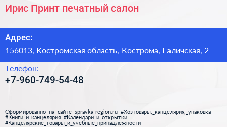 Ирис Принт, печатный салон по адресу 156013, Костромская область, Кострома, Галичская, 2 в дальнейшем Организация, размещена в следующих категориях: