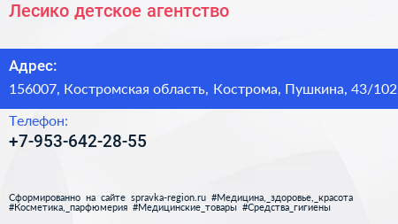 Лесико, детское агентство по адресу 156007, Костромская область, Кострома, Пушкина, 43/102 в дальнейшем Организация, размещена в следующих категориях: