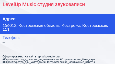 LevelUp Music, студия звукозаписи по адресу 156012, Костромская область, Кострома, Костромская, 111 в дальнейшем Организация, размещена в следующих категориях: