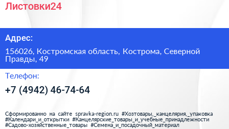 Листовки24 по адресу 156026, Костромская область, Кострома, Северной Правды, 49 в дальнейшем Организация, размещена в следующих категориях: