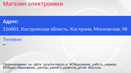 Магазин электроники по адресу 156001, Костромская область, Кострома, Московская, 98 в дальнейшем Организация, размещена в следующих категориях: