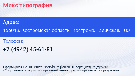 Микс, типография по адресу 156013, Костромская область, Кострома, Галичская, 100 в дальнейшем Организация, размещена в следующих категориях: