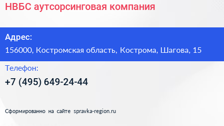 НВБС, аутсорсинговая компания по адресу 156000, Костромская область, Кострома, Шагова, 15 в дальнейшем Организация, размещена в следующих категориях: