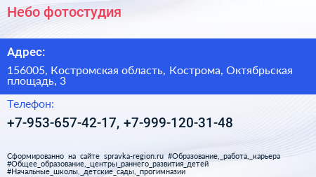Небо, фотостудия по адресу 156005, Костромская область, Кострома, Октябрьская площадь, 3 в дальнейшем Организация, размещена в следующих категориях: