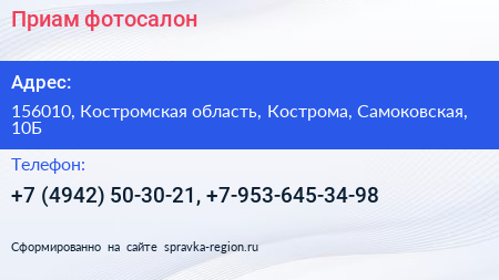 Приам, фотосалон по адресу 156010, Костромская область, Кострома, Самоковская, 10Б в дальнейшем Организация, размещена в следующих категориях:
