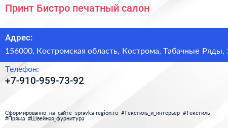 Принт Бистро, печатный салон по адресу 156000, Костромская область, Кострома, Табачные Ряды, 1 в дальнейшем Организация, размещена в следующих категориях: