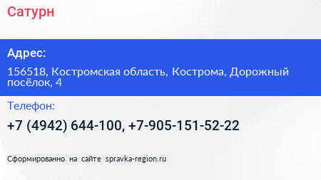 Сатурн по адресу 156518, Костромская область, Кострома, Дорожный посёлок, 4 в дальнейшем Организация, размещена в следующих категориях: