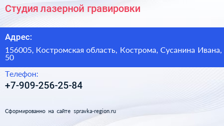 Студия лазерной гравировки по адресу 156005, Костромская область, Кострома, Сусанина Ивана, 50 в дальнейшем Организация, размещена в следующих категориях:
