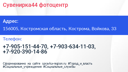 Сувенирка44, фотоцентр по адресу 156005, Костромская область, Кострома, Войкова, 33 в дальнейшем Организация, размещена в следующих категориях: