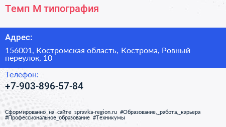 Темп-М, типография по адресу 156001, Костромская область, Кострома, Ровный переулок, 10 в дальнейшем Организация, размещена в следующих категориях:
