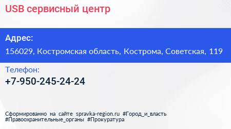 USB, сервисный центр по адресу 156029, Костромская область, Кострома, Советская, 119 в дальнейшем Организация, размещена в следующих категориях: