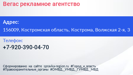 Вегас, рекламное агентство по адресу 156009, Костромская область, Кострома, Волжская 2-я, 3 в дальнейшем Организация, размещена в следующих категориях: