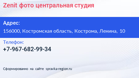 Zenit фото, центральная студия по адресу 156000, Костромская область, Кострома, Ленина, 10 в дальнейшем Организация, размещена в следующих категориях: