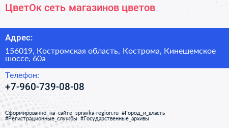 ЦветОк, сеть магазинов цветов по адресу 156019, Костромская область, Кострома, Кинешемское шоссе, 60а в дальнейшем Организация, размещена в следующих категориях: