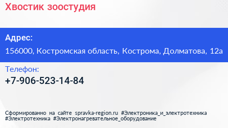 Хвостик, зоостудия по адресу 156000, Костромская область, Кострома, Долматова, 12а в дальнейшем Организация, размещена в следующих категориях: