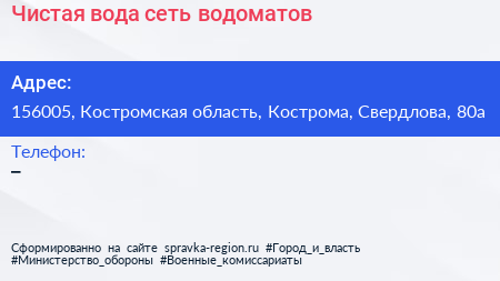Чистая вода, сеть водоматов по адресу 156005, Костромская область, Кострома, Свердлова, 80а в дальнейшем Организация, размещена в следующих категориях: