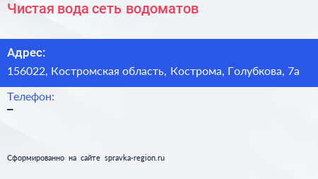 Чистая вода, сеть водоматов по адресу 156022, Костромская область, Кострома, Голубкова, 7а в дальнейшем Организация, размещена в следующих категориях: