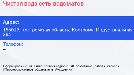 Чистая вода, сеть водоматов по адресу 156019, Костромская область, Кострома, Индустриальная, 28а в дальнейшем Организация, размещена в следующих категориях: