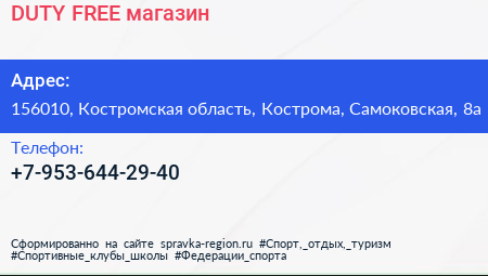 DUTY FREE, магазин по адресу 156010, Костромская область, Кострома, Самоковская, 8а в дальнейшем Организация, размещена в следующих категориях: