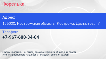 Форелька по адресу 156000, Костромская область, Кострома, Долматова, 7 в дальнейшем Организация, размещена в следующих категориях: