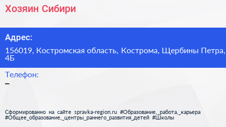 Хозяин Сибири по адресу 156019, Костромская область, Кострома, Щербины Петра, 4Б в дальнейшем Организация, размещена в следующих категориях: