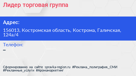 Лидер, торговая группа по адресу 156013, Костромская область, Кострома, Галичская, 124а/4 в дальнейшем Организация, размещена в следующих категориях: