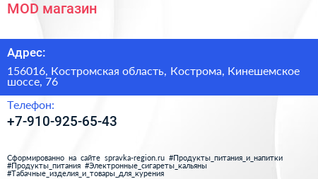 MOD, магазин по адресу 156016, Костромская область, Кострома, Кинешемское шоссе, 76 в дальнейшем Организация, размещена в следующих категориях: