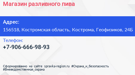 Магазин разливного пива по адресу 156518, Костромская область, Кострома, Геофизиков, 24Б в дальнейшем Организация, размещена в следующих категориях: