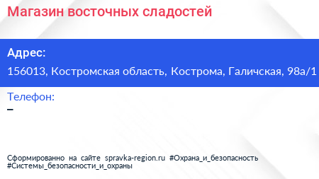 Магазин восточных сладостей по адресу 156013, Костромская область, Кострома, Галичская, 98а/1 в дальнейшем Организация, размещена в следующих категориях:
