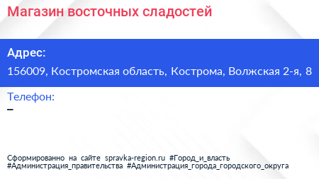 Магазин восточных сладостей по адресу 156009, Костромская область, Кострома, Волжская 2-я, 8 в дальнейшем Организация, размещена в следующих категориях: