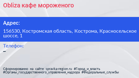 Obliza, кафе мороженого по адресу 156530, Костромская область, Кострома, Красносельское шоссе, 1 в дальнейшем Организация, размещена в следующих категориях: