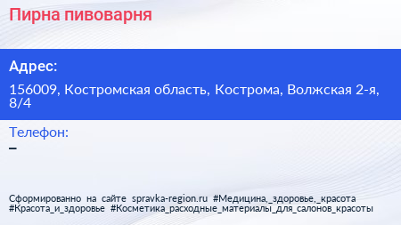 Пирна, пивоварня по адресу 156009, Костромская область, Кострома, Волжская 2-я, 8/4 в дальнейшем Организация, размещена в следующих категориях: