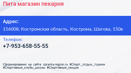 Пита, магазин-пекарня по адресу 156008, Костромская область, Кострома, Шагова, 150в в дальнейшем Организация, размещена в следующих категориях: