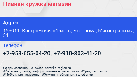 Пивная кружка, магазин по адресу 156011, Костромская область, Кострома, Магистральная, 51 в дальнейшем Организация, размещена в следующих категориях:
