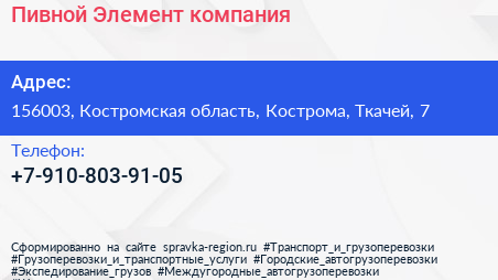 Пивной Элемент, компания по адресу 156003, Костромская область, Кострома, Ткачей, 7 в дальнейшем Организация, размещена в следующих категориях:
