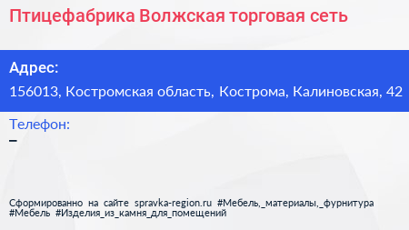 Птицефабрика Волжская, торговая сеть по адресу 156013, Костромская область, Кострома, Калиновская, 42 в дальнейшем Организация, размещена в следующих категориях: