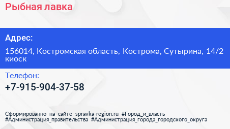 Рыбная лавка по адресу 156014, Костромская область, Кострома, Сутырина, 14/2 киоск в дальнейшем Организация, размещена в следующих категориях: