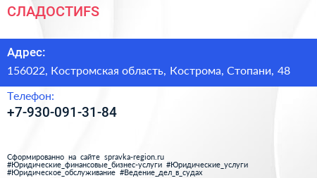 СЛАДОСТИFS по адресу 156022, Костромская область, Кострома, Стопани, 48 в дальнейшем Организация, размещена в следующих категориях: