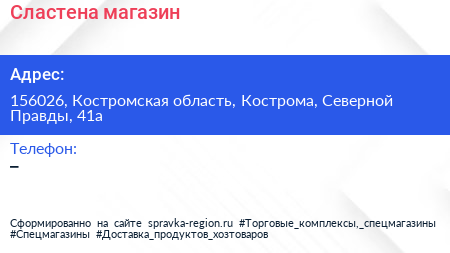 Сластена, магазин по адресу 156026, Костромская область, Кострома, Северной Правды, 41а в дальнейшем Организация, размещена в следующих категориях: